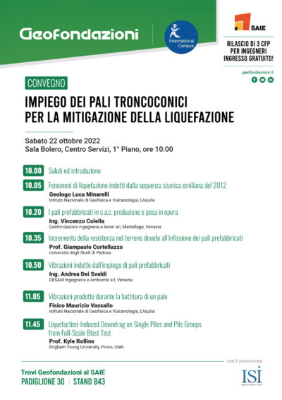 Sabato 22 ottobre 2022 presso la Sala Bolero del Centro Servizi di Bologna Fiere (1° Piano) a partire dalle ore 10.00 si terrà il convegno gratuito dal titolo “Impiego dei pali troncoconici per la mitigazione della liquefazione” organizzato da Geofondazioni in collaborazione con Internation Campus dove verrà presentato tale studio. La partecipazione al convegno darà diritto, per gli ingegneri, a 3 CFP. Posti limitati.